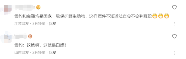 对此,有网友评价称:雪豹和金雕均是国家一级保护野生动物,这样案件不知道法官会不会判互殴。